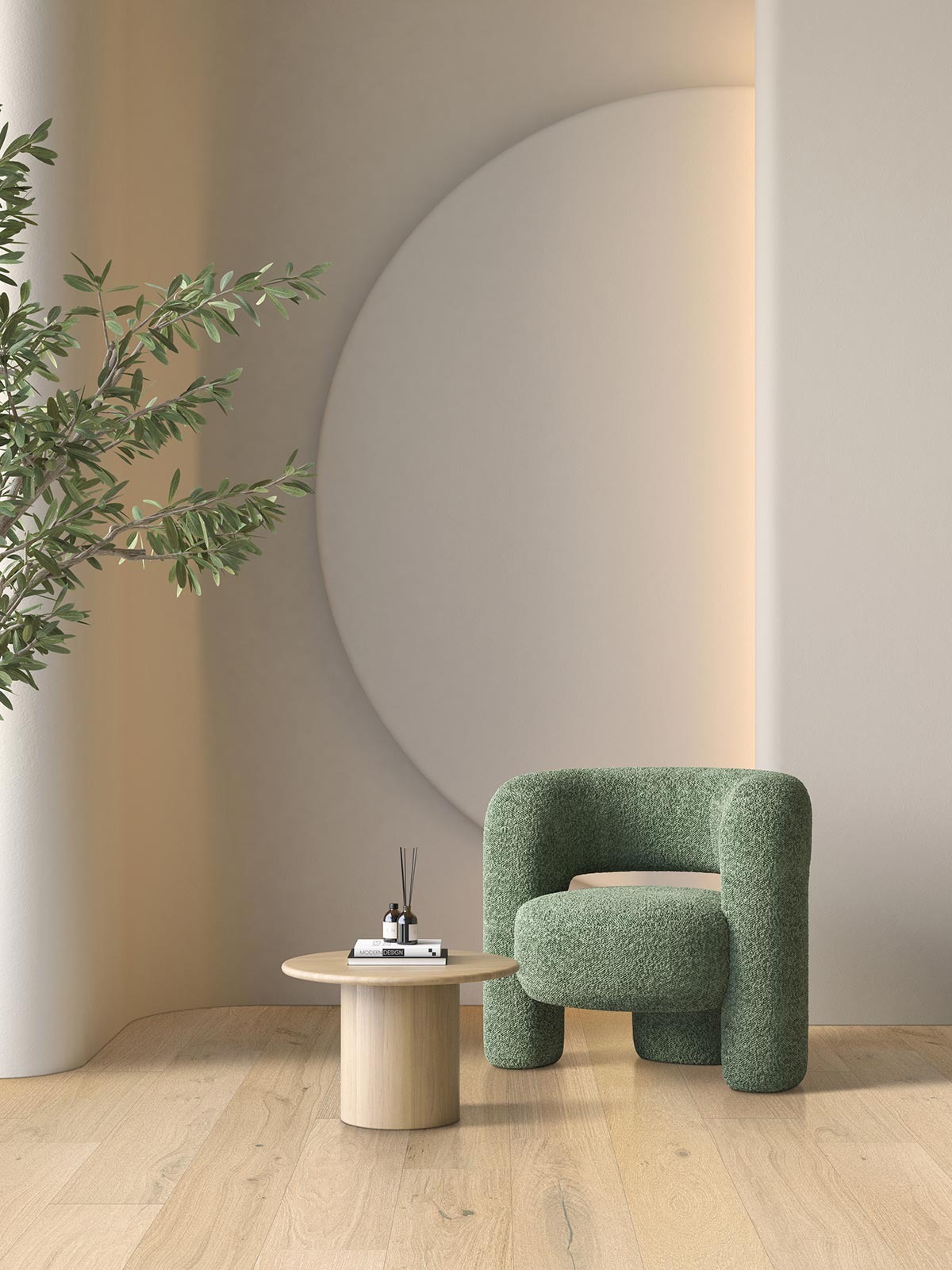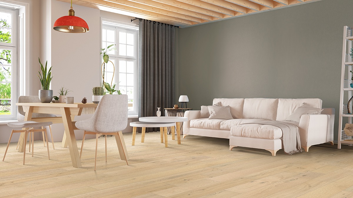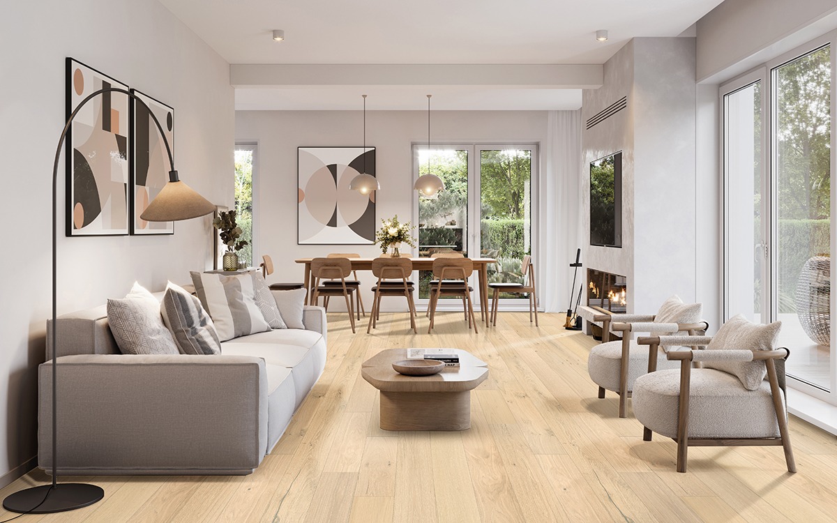 Broad planks minimize seams and create a clean, open flow throughout the room.