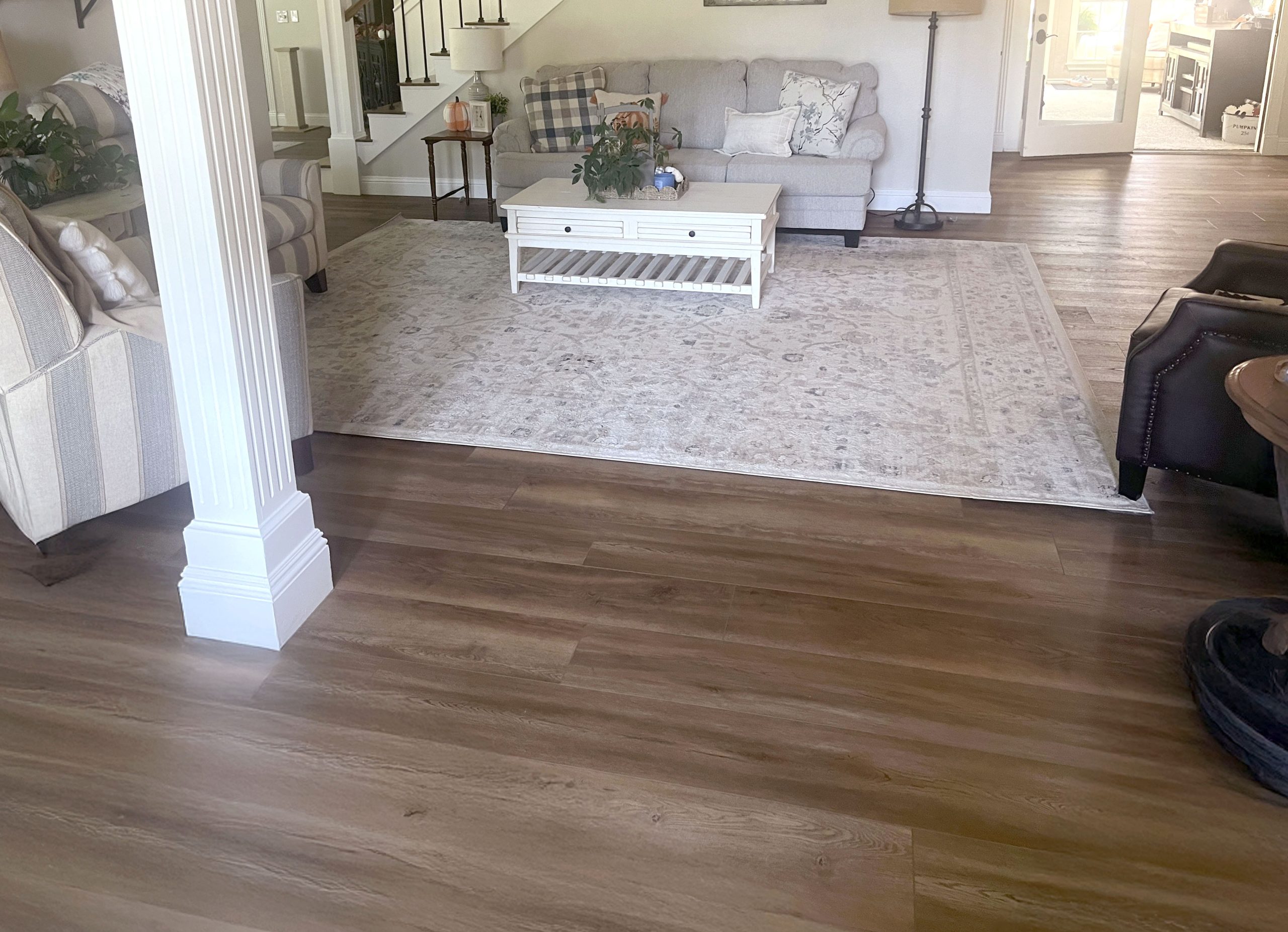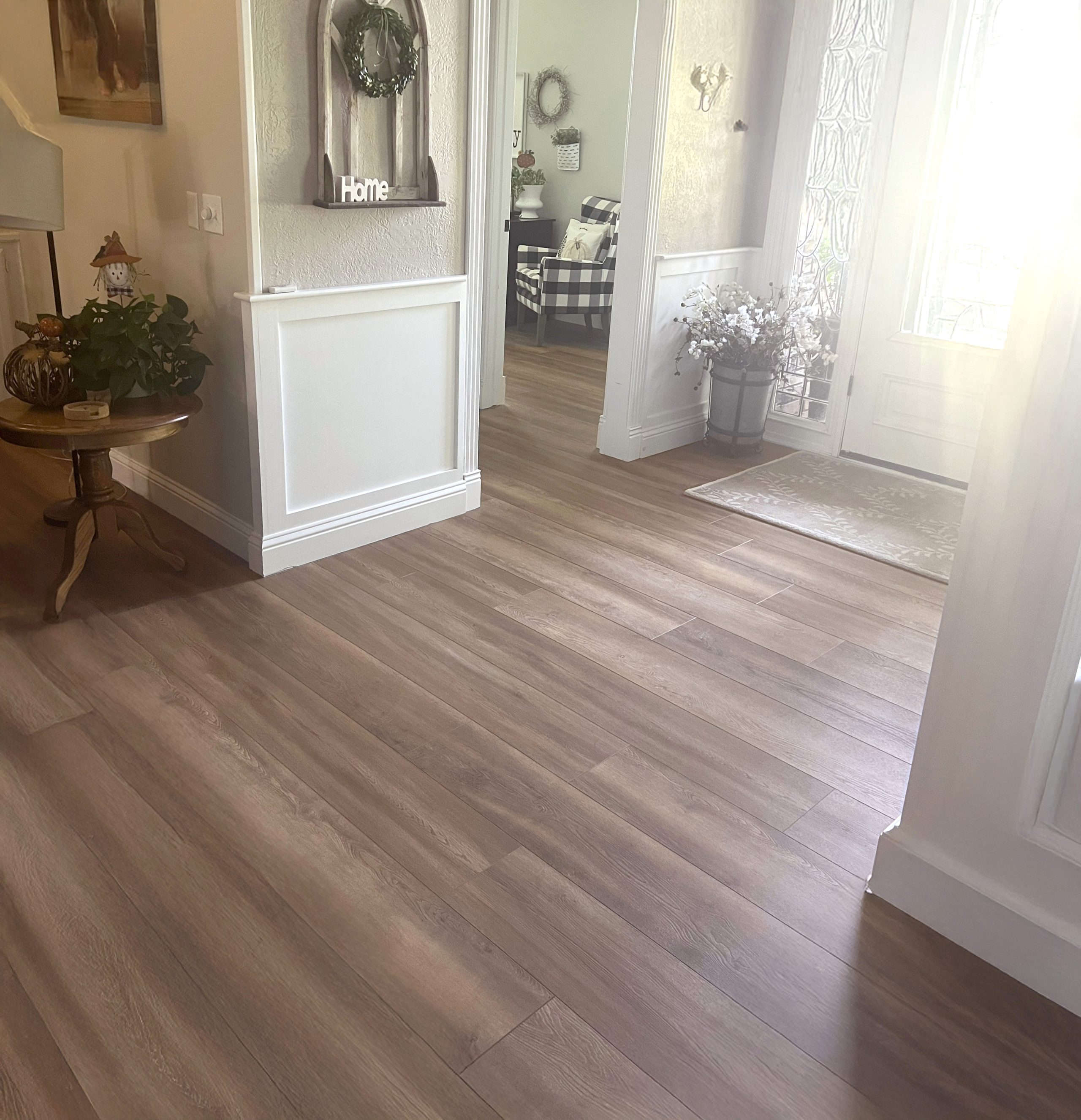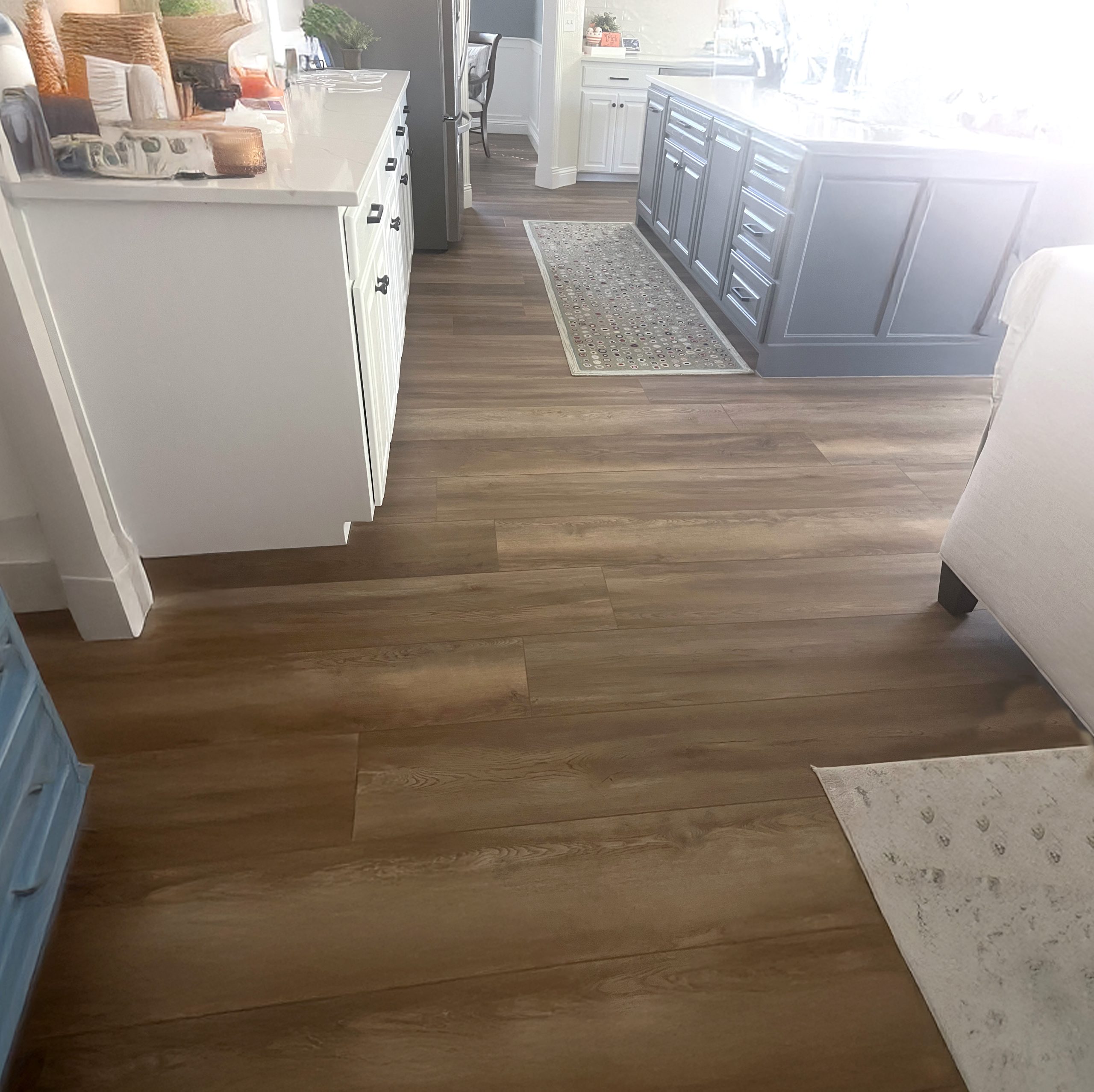 - Extra thick, wood-like vinyl planks with stunning grains in natural, neutral color palette