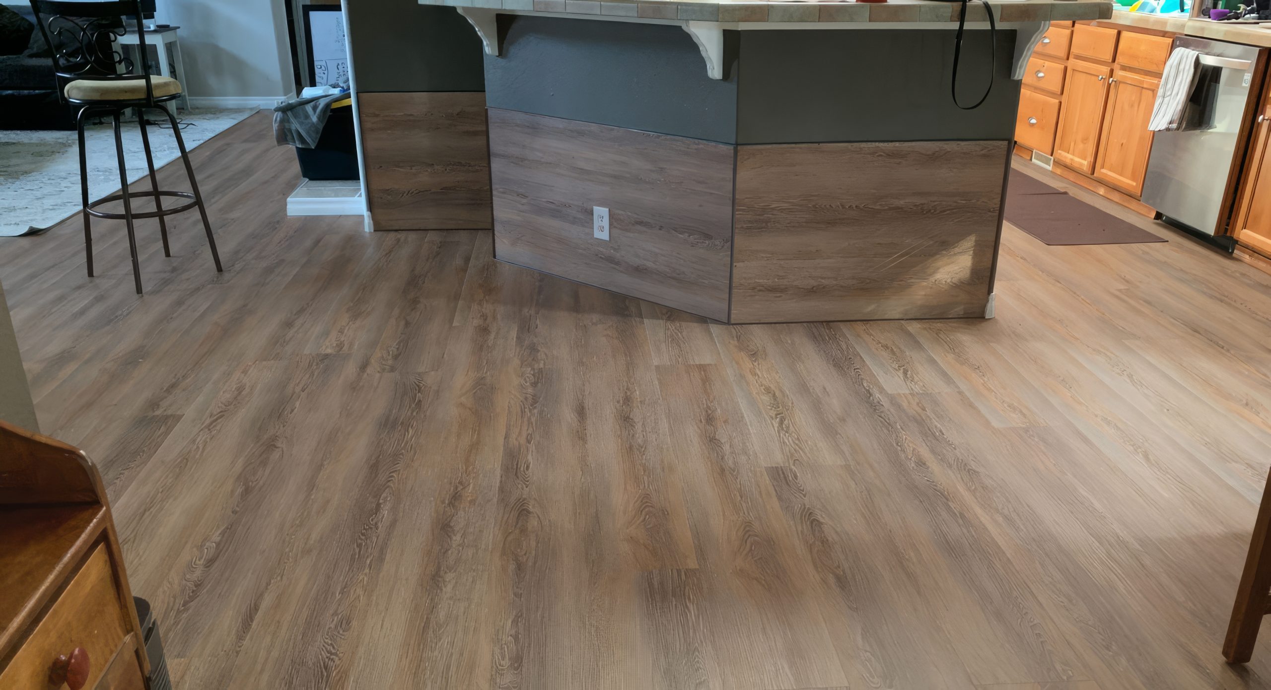 Tidal Pool Pine’s cooler sandy taupe tones ground spaces in steady color, while a light wood grain brings just the right amount of texture