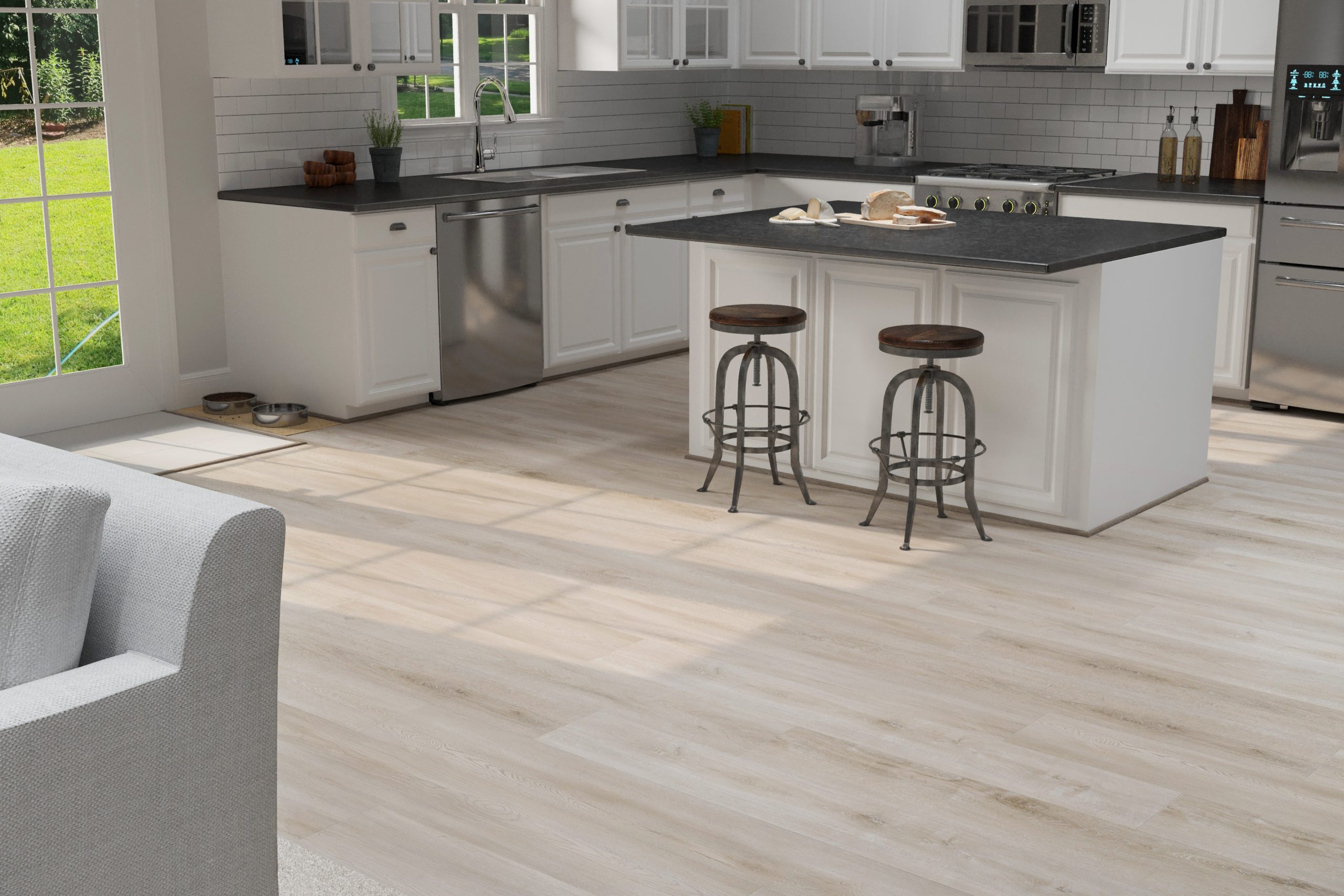 A light, overcast gray gleams with warm, silver undertones and authentic wood texturing. Legends luxury vinyl flooring offers extra broad dimensions with a natural beauty and plank thickness reminiscent of hardwood. Pet friendly, waterproof planks sport a sturdy WPC core, and are backed by an acoustic cushion, for quieter, more comfortable rooms. Specialized surface texturing makes planks feel as authentic as they look, with an extra thick wear layer for boosted scratch protection.